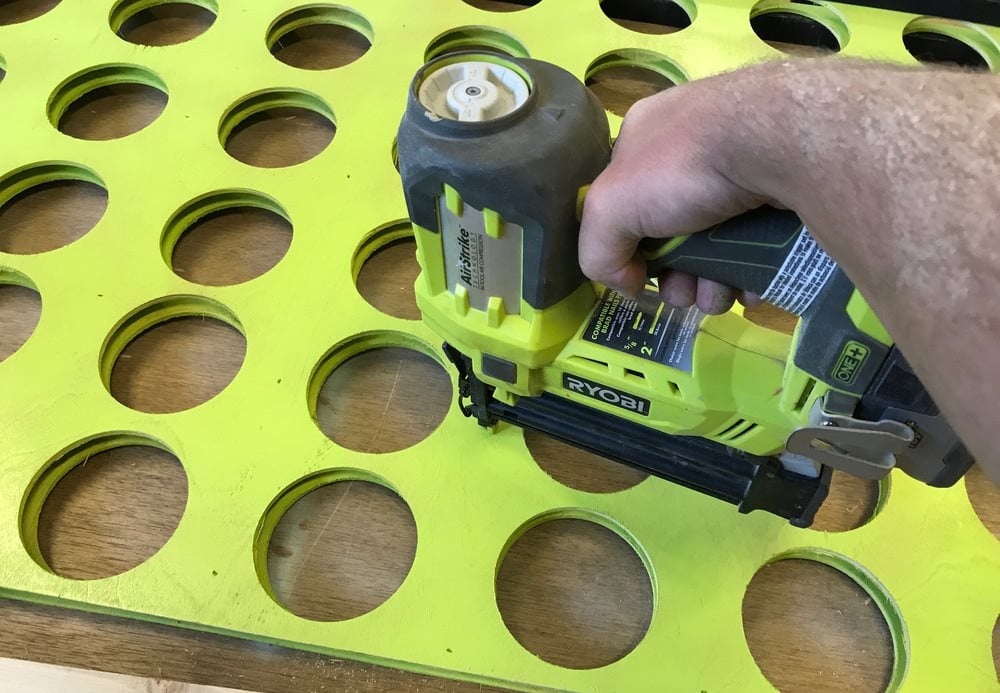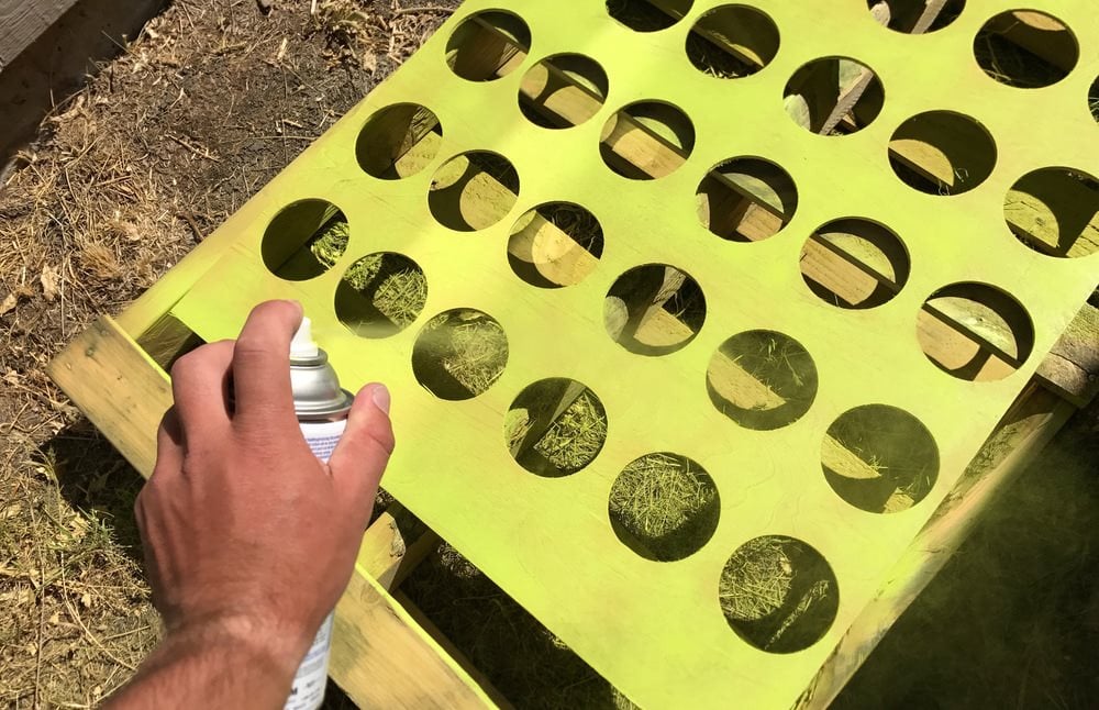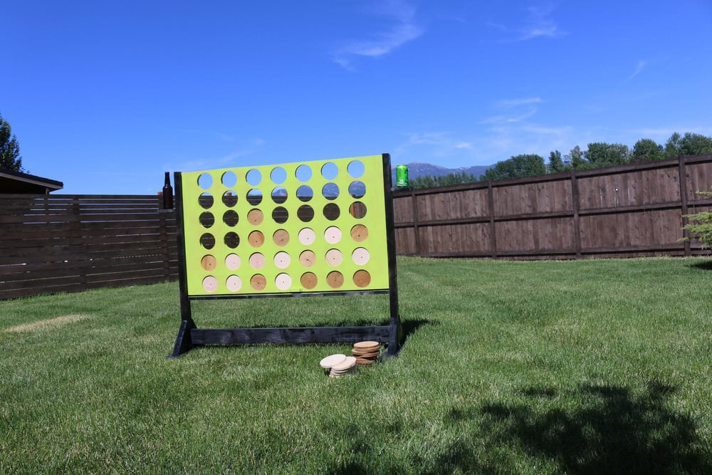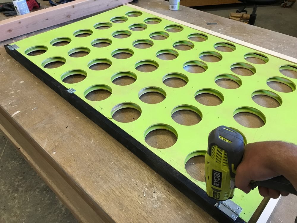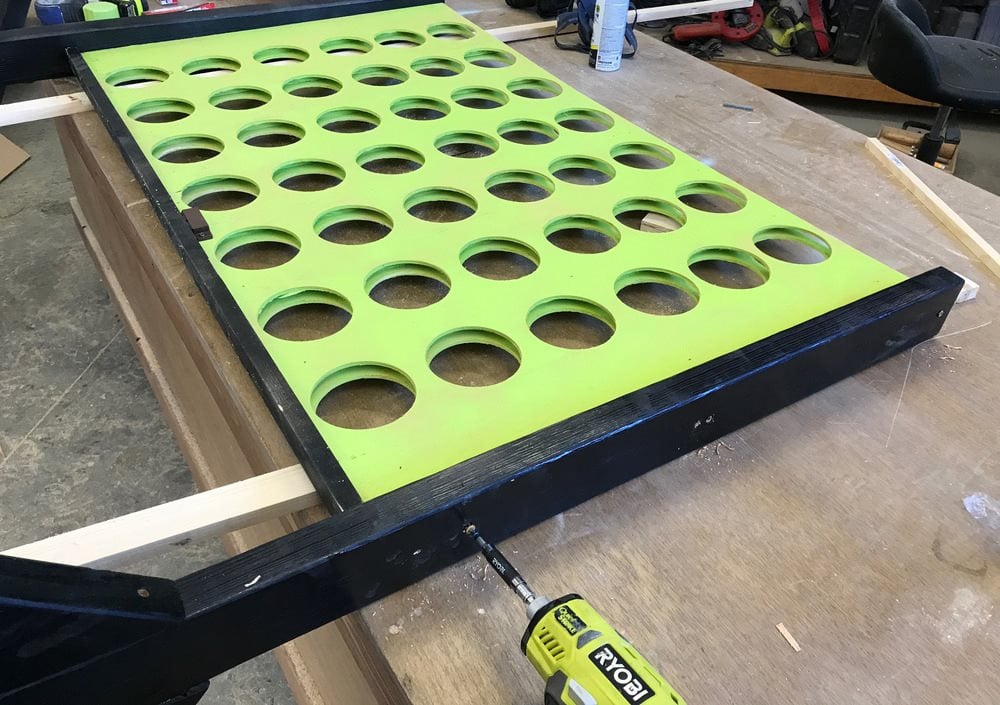 Lägg till ett 122 cm brett nedre stöd för att ge stativet ytterligare styrka. Måla eller betsa hälften av skivorna så att 21 har en annan färg än de övriga 21. Njut av ditt spel med fyra i rad!