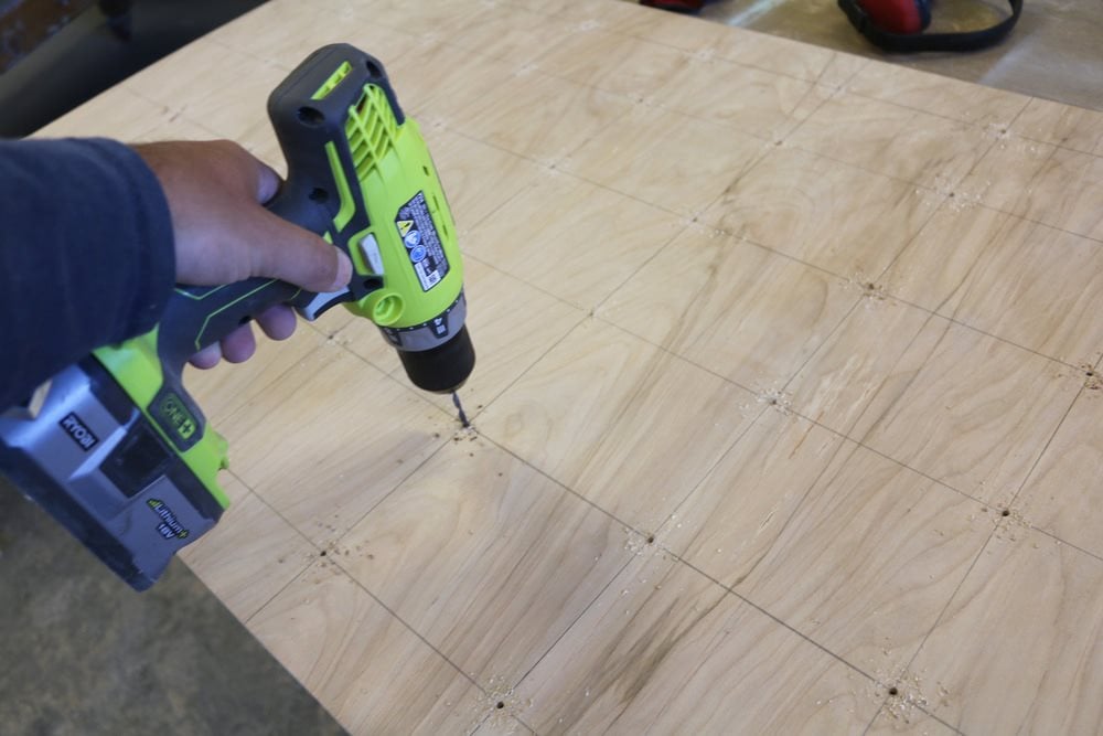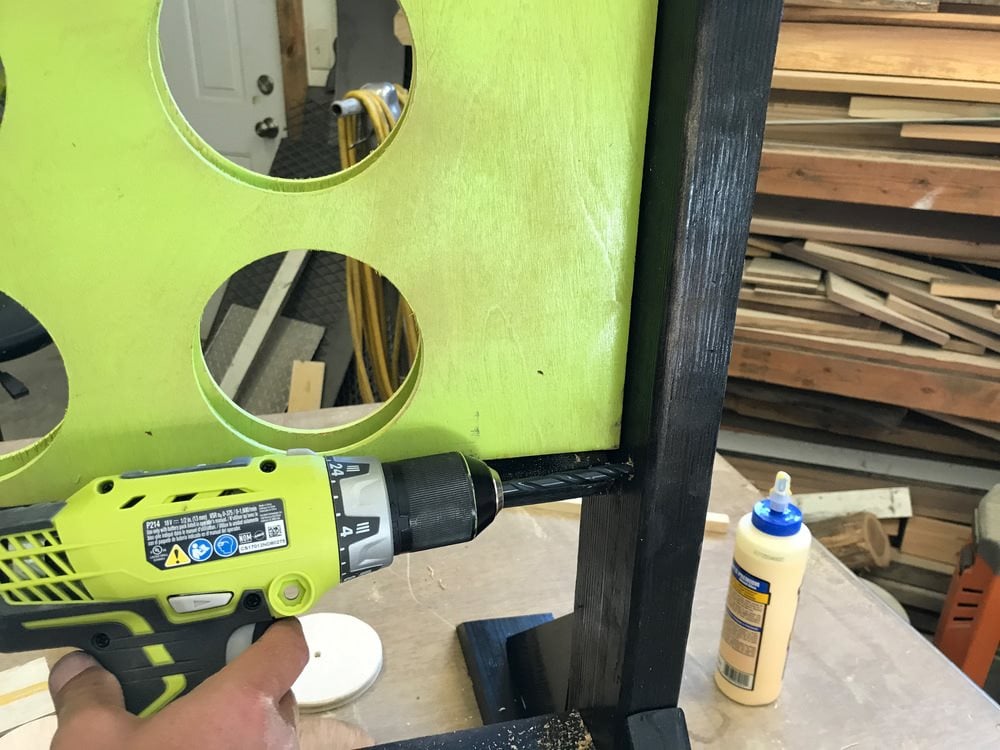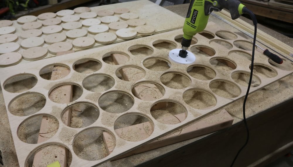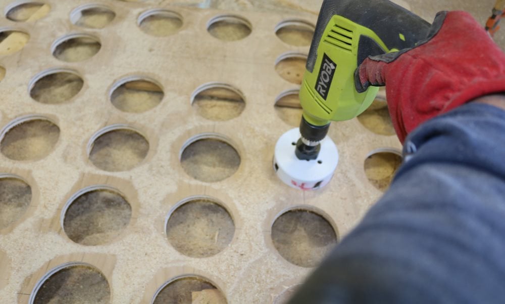 Borra ut cirklarna för de två 6,5 mm skivorna som är fastspända mot varandra med hjälp av en cirkelsåg. Fäst brädorna och ta god tid på dig för att säkert skära ut varje hål. En 18V batteridriven borrmaskin kommer att göra jobbet här. Var försiktig när du använder borrskruvdragaren med tillsatsen.